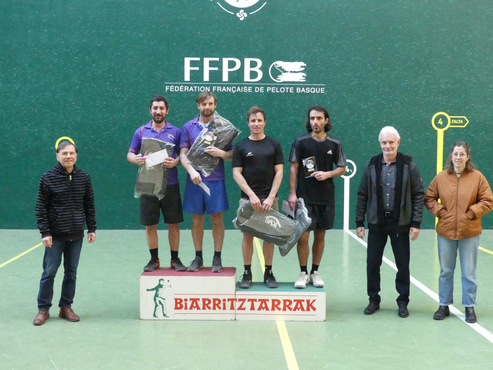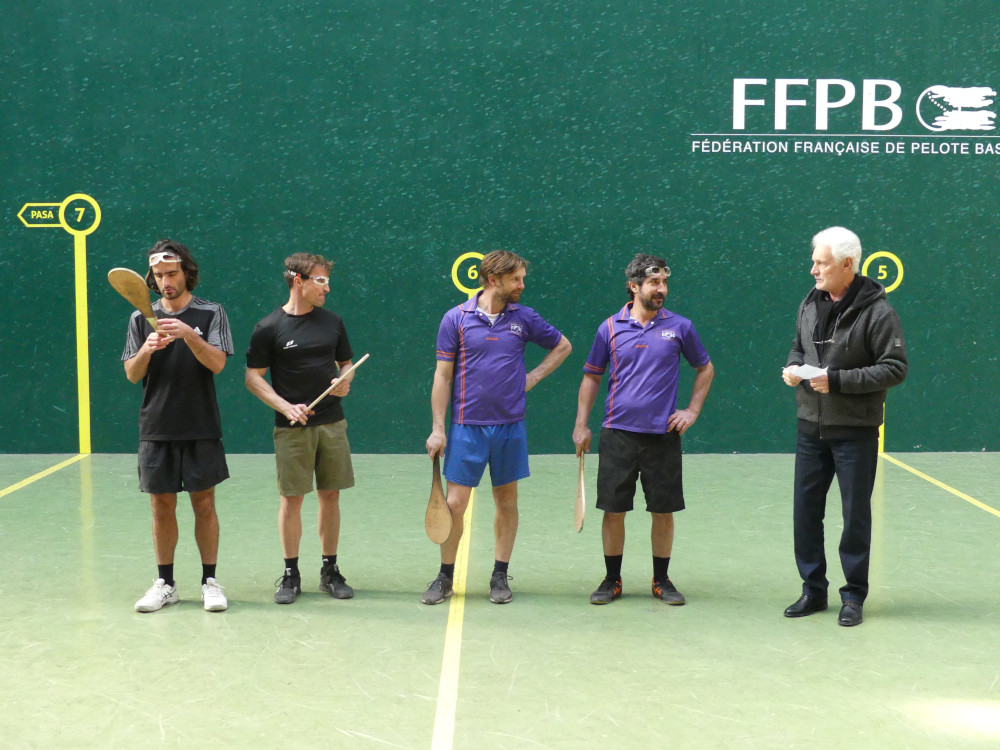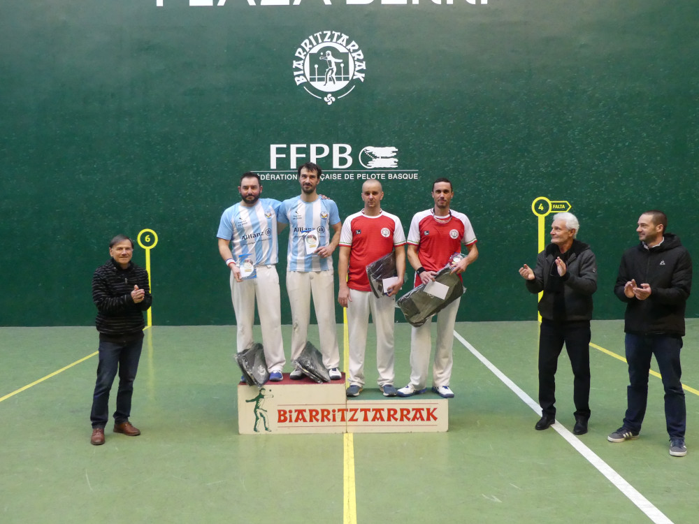 La finale de 1ère série aura bien tenu ses promesses. Belle partie de près d\’une heure de jeu, avec 4 acteurs qui ne se sont pas épargnés. De bonnes attaques à l\’avant à mettre au crédit de Thomas Nicol qui aurait pu insister pour peser davantage sur son vis à vis Christian Latxague toujours aussi lucide et efficace. De son côté Jérôme Thobert voulant par trop imposer sa puissance s\’est usé contre un Gérard Labeyrie impeccable de bout en bout. Au final, trop de fautes \ »grossières\ » par manque de maîtrise conduiront Jérôme et Thomas à s\’incliner sur le score de 35 à 28. Deuxième titre consécutif pour la paire Christian Latxague et Gérard Labeyrie. Félicitations à eux.