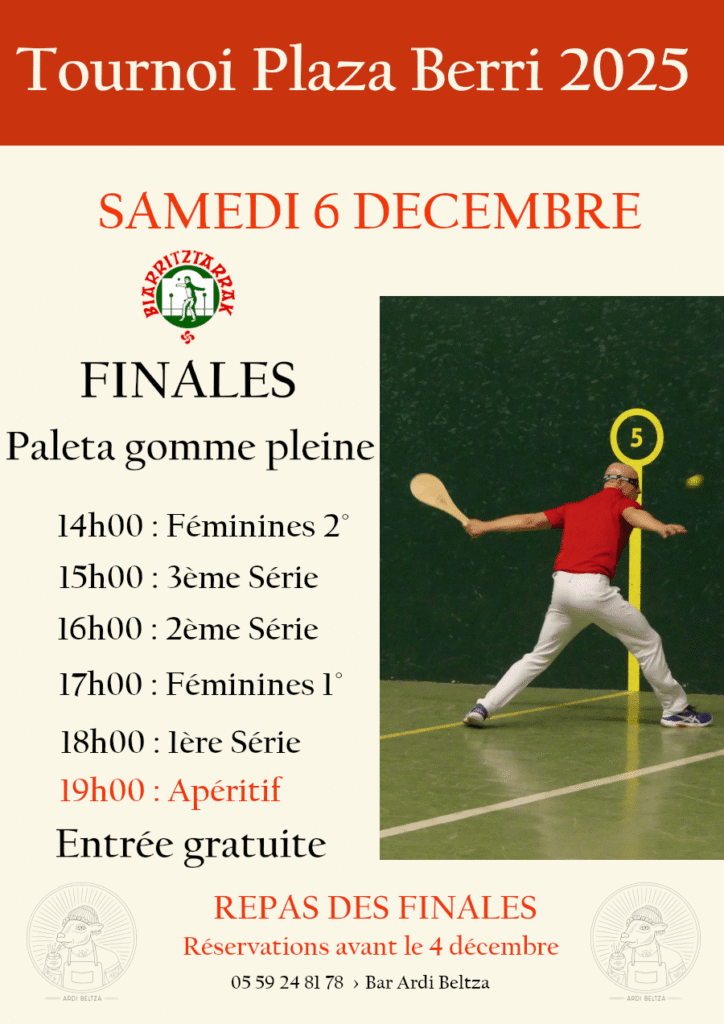 A l’issue des parties, vers 19h, un apéritif sera offert par le club de pelote BIARRITZTARRAK à tous les participants du tournoi. Le REPAS DES FINALES servi au bar « Ardi Beltza » du mur à gauche, clôturera l’édition 2025 du Tournoi de Plaza Berri… les réservations sont ouvertes jusqu’au 4 décembre: