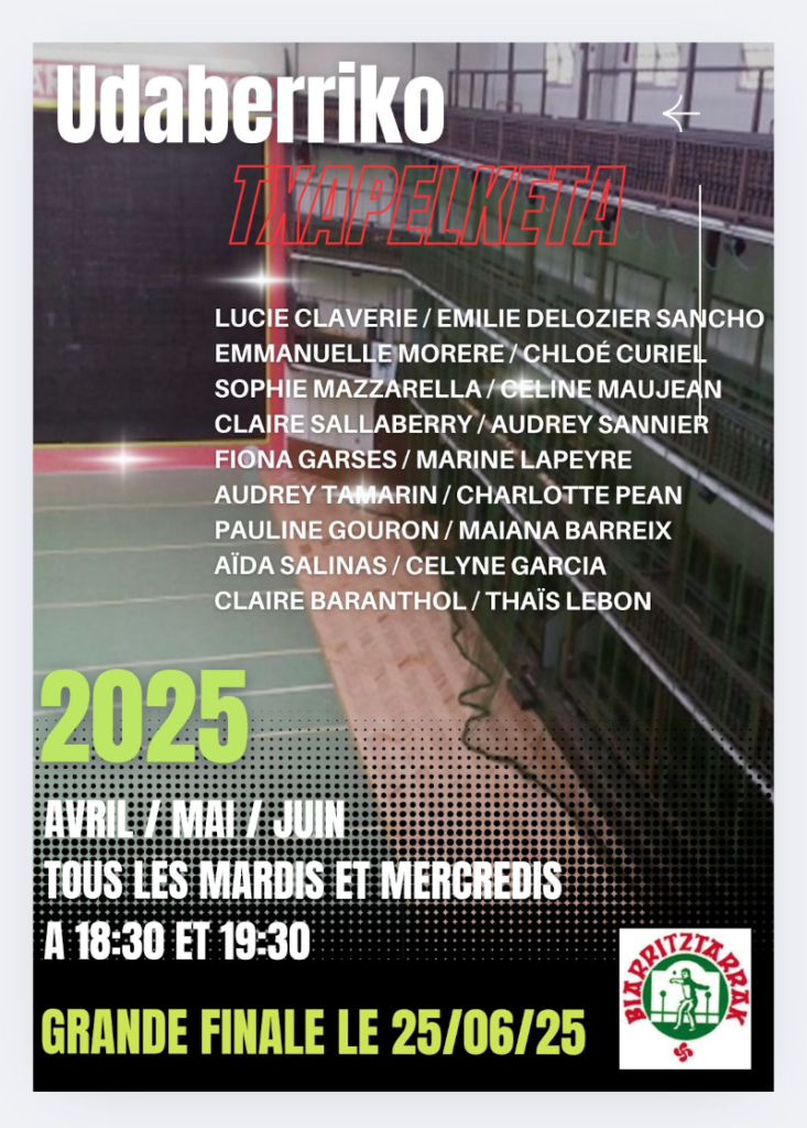 A l\’initiative de Francis Cartry, co-entraîneur de la section féminine et Secrétaire général de Biarritztarrak, ce tournoi interne à paleta gomme pleine est réservé aux filles licenciées du club. Il se déroulera jusqu\’au 25 juin jour de la FINALE.
